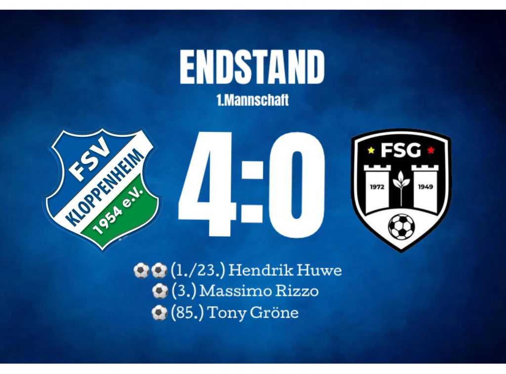 Der FSV blieb weiter am Drücker und in Minute 23 war es erneut H. Huwe, der per Kopf für den FSV traf. Nach einem schön getretenen Freistoß von T. Kehl konnte der Schlussmann der Gäste den wuchtigen Kopfball von Huwe nicht festhalten und der Ball kullerte zum 3:0 ins Tor. Weitere Chancen für den FSV waren da, jedoch blieb es – auch aufgrund einer hervorragenden Fußparade des Kloppenheimer Keepers Y. Benkmann – beim 3:0‑Pausenstand.